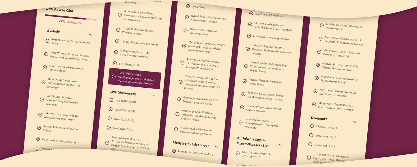 ⭐ Osobista Transformacja "Przez lata szukałam metod rozwoju osobistego, ale dopiero w QRS Power Club znalazłam coś, co naprawdę działa. To nie są puste obietnice - to realne narzędzia i techniki, które zmieniają życie. Najważniejsze jest to, że mamy stałe wsparcie grupy i mentorów, którzy przeszli tę drogę przed nami." - Ewa